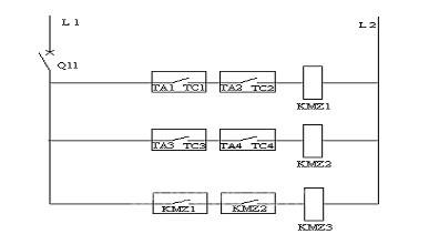 控制線路如圖4,四臺(tái)變頻器上電后,每臺(tái)變頻器運(yùn)行準(zhǔn)備好后,設(shè)置變頻器故障繼電器輸出端子的輸出選項(xiàng)為“變頻器運(yùn)行準(zhǔn)備好”,只有變頻器上電,并且正常以后,才可以并接在一起,如任意一臺(tái)有故障,直流母線接觸器就不吸合。變頻器故障繼電器輸出端子TA、TC為常開(kāi)觸點(diǎn),上電后變頻器“變頻器運(yùn)行準(zhǔn)備好”,各變頻器的TA、TC吸合,直流母線并聯(lián)接觸器依次吸合。否則接觸器就斷開(kāi)。