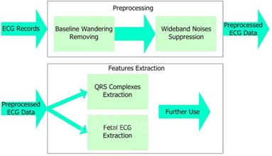 從功能上來(lái)說(shuō),心電信號(hào)的處理可以大致分為兩個(gè)階段:預(yù)處理和特征提取(如圖3所示)。預(yù)處理階段消除和減少原始心電信號(hào)中的噪聲,而特征提取階段則從心電信號(hào)中提取診斷信息。