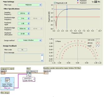通過(guò)LabVIEW圖形化和交互式的方法,可以高效地設(shè)計(jì)和實(shí)現(xiàn)有限沖擊響應(yīng)(FIR)或無(wú)限沖擊響應(yīng)(IIR)濾波器。例如,用戶(hù)可以使用Classical Filter Design 設(shè)計(jì)Kaiser窗FIR高通濾波器消除基準(zhǔn)漂移。圖4顯示了使用高通濾波器消除基準(zhǔn)漂移的實(shí)例。