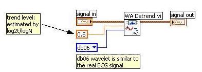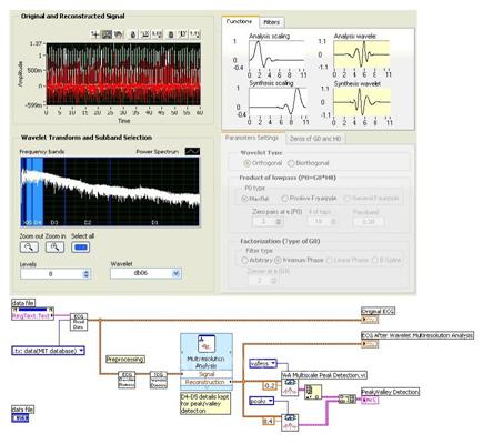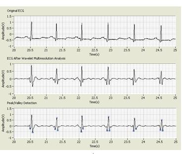 因?yàn)樾〔軌蚪柚诙喾直媛实膬?yōu)勢(shì)對(duì)帶噪聲的信號(hào)進(jìn)行主要特征的提取與分析,所以近年來(lái)提出了許多基于小波的檢測(cè)方法。在本文中,LabVIEW高級(jí)信號(hào)處理工具包中的Multiscale Peak Detection函數(shù)被用于檢測(cè)Q、R和S點(diǎn)。在波峰/波谷檢測(cè)前,使用Multiresolution Analysis Express函數(shù)將心電信號(hào)分解為8級(jí)的Daubechies6 (db06)小波,然后使用D4和D5子帶重建出信號(hào)。之所以可以利用D4和D5子帶進(jìn)行重建,是因?yàn)閹缀跛械?/SPAN>QRS細(xì)節(jié)都處于這兩個(gè)子帶中,這使得QRS檢測(cè)更為精確。