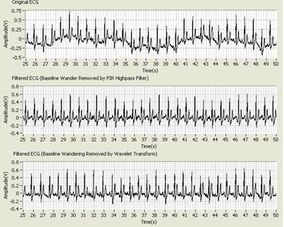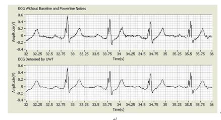 通過(guò)小波變換將心電信號(hào)分解到各個(gè)子帶,然后利用閾值或收縮功能調(diào)整小波系數(shù),最后重建出消除噪聲后的信號(hào)。下圖顯示了通過(guò)LabVIEW中非抽樣小波變換(UWT),寬帶噪聲被極大地抑制而心電信號(hào)的細(xì)節(jié)則保持不變。