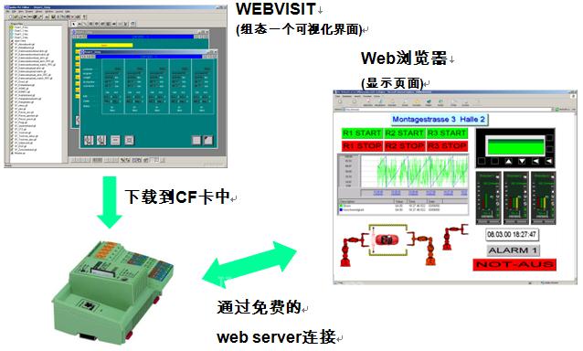 Web服務(wù)器提供了一個(gè)用于所有100系列控制器的免費(fèi)網(wǎng)頁(yè)。這些網(wǎng)頁(yè)可以使用WebVisit軟件顯示,并使用數(shù)據(jù)連接到PLC程序。集成瀏覽器的Web面板顯示各網(wǎng)頁(yè),并允許其可視化而無(wú)需任何Java知識(shí)。