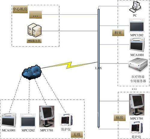研祥終端智慧醫(yī)療產(chǎn)品解決方案由中心機(jī)房、無(wú)線/3G/有線網(wǎng)絡(luò)及研祥終端智慧醫(yī)療產(chǎn)品及各種醫(yī)療儀器構(gòu)成。移動(dòng)醫(yī)療終端MCA-1001、病床終端MPC1701和各種監(jiān)護(hù)儀器通過(guò)無(wú)線/3G/有線接入醫(yī)療網(wǎng)絡(luò)平臺(tái)及各種信息系統(tǒng),醫(yī)療終端專用服務(wù)器通過(guò)無(wú)線/3G/有線網(wǎng)絡(luò)在各終端設(shè)備和中心機(jī)房之間傳遞交換相關(guān)資料和數(shù)據(jù)。這樣就構(gòu)成了一個(gè)實(shí)用的用于醫(yī)療信息系統(tǒng)的物聯(lián)網(wǎng)。