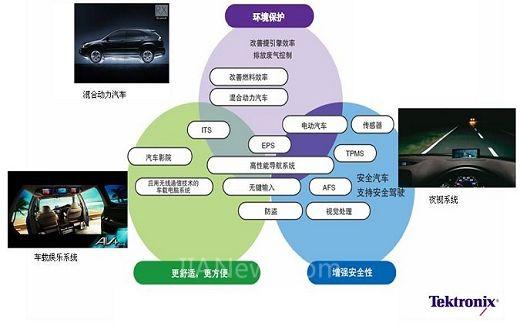 然而,面對(duì)日益復(fù)雜的汽車(chē)設(shè)計(jì)需求,特別是要推出中高端和商用的新能源汽車(chē)之時(shí),自主創(chuàng)新和開(kāi)發(fā)之路并非坦途。泰克科技的專(zhuān)家曾在不久前舉辦的一場(chǎng)汽車(chē)電子技術(shù)論壇上以擁有“100多個(gè)ECU、軟件代碼已經(jīng)達(dá)到700萬(wàn)行”的豐田L(fēng)exus460汽車(chē)為例,強(qiáng)調(diào)了電子部件在汽車(chē)特別是高端汽車(chē)中所占據(jù)的比例越來(lái)越高?!叭鐖D1,汽車(chē)電子關(guān)乎目前汽車(chē)設(shè)計(jì)的三大市場(chǎng)挑戰(zhàn),即如何滿(mǎn)足生態(tài)(環(huán)境保護(hù))、更舒適方便和增強(qiáng)安全性的要求,而圍繞解決這些挑戰(zhàn)的系統(tǒng)和子系統(tǒng)正是目前汽車(chē)電子設(shè)計(jì)的熱點(diǎn)和難點(diǎn)?!彼赋觥!岸钟蚓W(wǎng)、動(dòng)力系統(tǒng)、電子控制單元和數(shù)字RFID的應(yīng)用在改善汽車(chē)生態(tài)學(xué)、安全性和舒適性方面扮演了重要的角色。