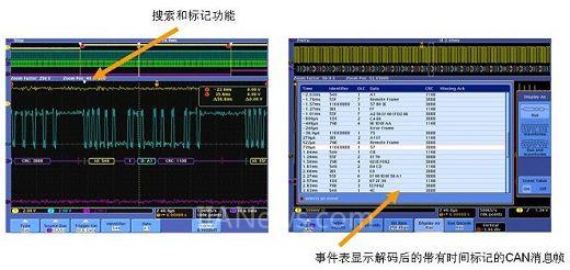 對(duì)于汽車(chē)中常用的CAN、LIN這類(lèi)低速串行總線的調(diào)試,泰克的DPO/MSO4000系列示波器提供了簡(jiǎn)單、易用、完整、高品質(zhì)的觸發(fā)、捕獲和解碼解決方案。如圖2,該示波器系列提供了搜索和標(biāo)記功能,可在事件表顯示解碼后的帶有時(shí)間標(biāo)記的CAN消息幀,這一功能是其他競(jìng)爭(zhēng)性產(chǎn)品所不具備的。