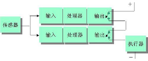 這種結構的輸入方式有兩種:一種為一個傳感器接到兩個輸入點上(可以使用同一個模塊的兩個點,也可以使用兩個模塊的兩個點,廠商推薦用戶最好采用不同機架上的兩個不同模塊的兩個點);一種為兩個傳感器或者一個傳感器的兩個接點接到兩個輸入點,這樣可以進一步提高輸入信號的可靠性(傳感器冗余)。