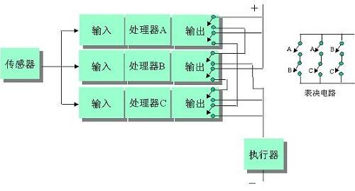 如果在一些控制系統(tǒng)的應用中,根本不允許失效模式的出現,那么三選二系統(tǒng)是一種最牢靠的選擇。當要防止兩種失效模式的出現時,系統(tǒng)的結構變的非常復雜。一種既可以容忍“安全”失效,又可以容忍“危險”失效的結構設計就是三選二結構(三個單元中選擇兩個相同的結果用于安全功能,圖4)。這種帶有三個控制器單元的結構提供了即有安全性又有高可用性的系統(tǒng) 。這種系統(tǒng)被稱為TMR(三重模塊冗余)系統(tǒng)。