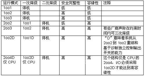 總之,從不同系統(tǒng)結構角度來看安全性和可用性,會使多數用戶感到困惑。 下表描述了系統(tǒng)結構對一個中央流程單元或控制器一旦失效發(fā)生所帶來的影響。在每種情況中,達到的安全完整性和容錯性僅代表冗余對安全性和可用性的影響。做為冗余,僅有一個測量值來考慮安全性和可用性是不夠的,還要考慮很多其他的因素。