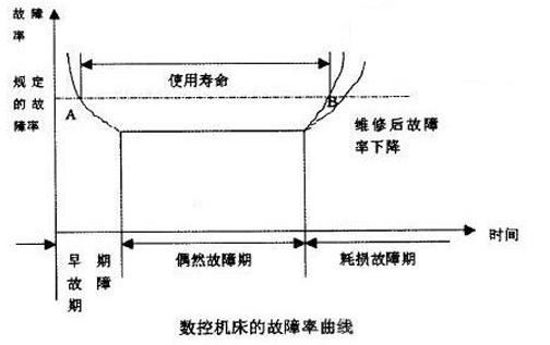 如圖所示,早期故障是指機(jī)床使用初期,由于設(shè)計(jì)或生產(chǎn)等原因引起的故障,在這段時(shí)間內(nèi),機(jī)械處于磨合階段,機(jī)械零件或電子元器件經(jīng)受不了初期的考驗(yàn)而損壞。所以故障發(fā)生的頻率相對(duì)來(lái)講要高一些。偶然故障是指機(jī)床投入使用一段時(shí)間后,產(chǎn)品的故障率降到較低的水平,但基本上處于平衡狀態(tài),此時(shí),可以認(rèn)為故障率為常數(shù),這個(gè)時(shí)期,機(jī)床的故障主要是由偶然因素引起的偶然故障,是機(jī)床的主要使用期,一般為7~10年。耗損故障是通過(guò)事前檢測(cè)或監(jiān)測(cè)可預(yù)測(cè)到的故障,是由于機(jī)床的規(guī)定隨時(shí)間增加而逐漸衰退引起的,耗損故障可以通過(guò)預(yù)防維修,防止故障發(fā)生,延長(zhǎng)使用壽命,或在將到耗損期前及時(shí)更新以保證機(jī)床的使用壽命。