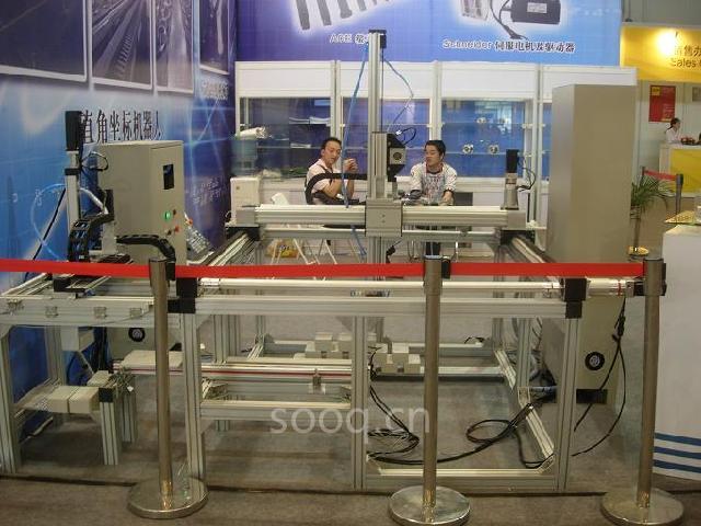 此次我們公司向觀眾展示的物料碼垛輸送線集上料,輸送,下料碼垛三個(gè)工序。機(jī)器人軌道全部采用德國(guó)高速,高精度直線運(yùn)動(dòng)單元,全部采用精密伺服電機(jī)帶動(dòng)??刂撇糠址譃樯狭峡刂乒?,輸送及下料控制柜,系統(tǒng)采用高運(yùn)算數(shù)控系統(tǒng)及PLC,觸摸屏。機(jī)械手抓完全有我公司自行設(shè)計(jì),配備小型直線氣缸,可迅速完成手抓的夾料和放料。工作時(shí),小型上料機(jī)械手從指定的幾個(gè)位置將物料夾緊輸送到直線傳送軌道上,在由直線傳送軌道運(yùn)輸?shù)街付?zhǔn)確位置,到位后大型下料碼垛機(jī)械手移動(dòng)過來將物料夾緊,輸送到下料工位,并將物料按照預(yù)設(shè)的擺放方式準(zhǔn)確堆放。控制部分分別選用了數(shù)控系統(tǒng)和PLC,觸摸屏,客戶在操作的時(shí)候,可以預(yù)先在電腦中編輯好程序在傳送到控制系統(tǒng),或者通過觸摸屏直接編輯參數(shù),以達(dá)到滿意的效果。我們的物料碼垛機(jī)械手工作范圍可達(dá)20米,負(fù)載從幾公斤到幾噸均可。運(yùn)行速度最高可達(dá)10米/秒,并可任意調(diào)整。動(dòng)作靈活,操作簡(jiǎn)單,工作穩(wěn)定,安全可靠。