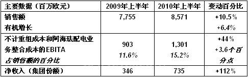 第二季度銷售額達(dá)兩位數(shù)增長率,息稅及攤銷前利潤率(EBITA Raito)提高3. 6個百分點至15.2%,凈利潤增長一倍,達(dá)到7.35億歐元,2010年EBITA Raito目標(biāo)提高至15.5%