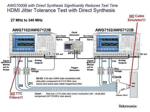 圖2:泰克獨(dú)一無(wú)二的AWG7000B直接合成方案可替換和省去所有類(lèi)型的線纜仿真器和多達(dá)40個(gè)TTC濾波器,大幅降低HDMI接收端抖動(dòng)容限測(cè)試的復(fù)雜度,并有效降低成本。