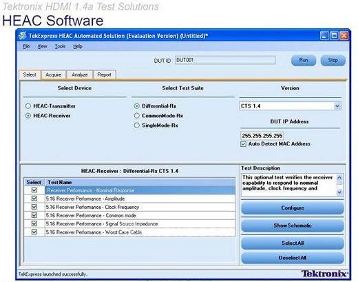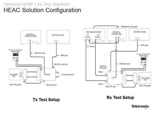 泰克的測(cè)試解決方案不僅Type D(移動(dòng)HDMI)和Type E(車(chē)用HDMI)新興應(yīng)用通吃之外(無(wú)需硬件仿真器,并且相關(guān)夾具產(chǎn)品都通過(guò)了CTS1.4的批準(zhǔn)),而且還能實(shí)現(xiàn)驗(yàn)證HDMI 以太網(wǎng)和音頻回傳通道(HEAC) 、3D HDMI強(qiáng)制格式、4K x 2K 和新的色彩空間格式。HEAC的物理層測(cè)試包括以太網(wǎng)發(fā)送、接收測(cè)試;音頻發(fā)送、接收測(cè)試;以及設(shè)備阻抗測(cè)試和線纜測(cè)試。同樣是通過(guò)軟硬件結(jié)合進(jìn)行模擬的方法使得用戶無(wú)需投資購(gòu)買(mǎi)更多測(cè)試儀,只要購(gòu)買(mǎi)相應(yīng)夾具,可在原有示波器、信號(hào)發(fā)生器的基礎(chǔ)上進(jìn)行配置,可產(chǎn)生真正的HEAC信號(hào)。