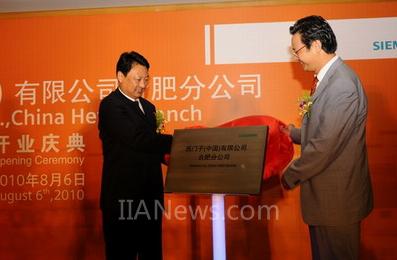 合肥市副市長(zhǎng)高維嶺(左)與西門(mén)子(中國(guó))有限公司副總裁兼安徽省總經(jīng)理王偉國(guó)共同為西門(mén)子合肥分公司揭牌