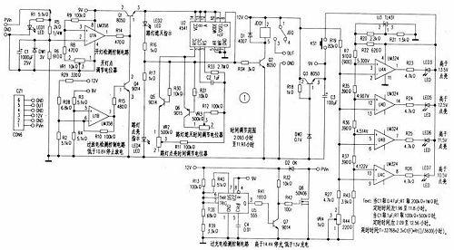 該電路由以 U5 為核心組成的蓄電池過(guò)充電控制電路、以 U 4A ~U4D為核心組成的蓄電池電壓指示電路及顯示電壓按鈕開(kāi)關(guān) KS1 電路、以 U1B 組成的蓄電池過(guò)放電控制電路、以 U1A組成的開(kāi)燈檢測(cè)控制電路、以 U2 組成的開(kāi)燈及延時(shí)熄燈及二次開(kāi)燈定時(shí)控制電路,以及以控制三極管Q2驅(qū)動(dòng)繼電器組成的輸出控制電路等組成?,F(xiàn)分別介紹如下。
