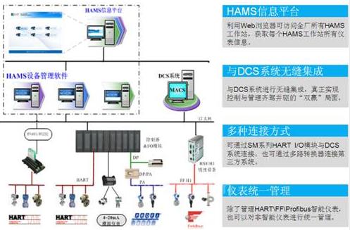 HAMS是和利時(shí)公司針對(duì)工廠設(shè)備資產(chǎn)管理的解決方案,以HART、FF和Profibus協(xié)議為基礎(chǔ),以國(guó)外先進(jìn)設(shè)備集成技術(shù)EDDL(Electronic Device Description language,電子設(shè)備描述語言)技術(shù)和FDT/ DTM(Field Device Tool/Device Type Manager,現(xiàn)場(chǎng)設(shè)備工具/設(shè)備類型管理器)技術(shù)為技術(shù)手段,集數(shù)據(jù)采集和數(shù)據(jù)分析于一體,主要用于實(shí)現(xiàn)工廠儀表的遠(yuǎn)程配置與診斷、在線調(diào)校、標(biāo)定管理、預(yù)測(cè)性維護(hù)以及日志記錄跟蹤等功能。HAMS提供的設(shè)備管理與維護(hù)功能,使智能設(shè)備能夠發(fā)揮最大效益,減少儀表的損耗并降低維護(hù)成本,為用戶提供一個(gè)快速方便統(tǒng)一的管理平臺(tái),使得工廠能夠在減少操作、降低維護(hù)工作量和減少運(yùn)營(yíng)成本的同時(shí),大幅提高工廠設(shè)備的可用性、生產(chǎn)能力和產(chǎn)品質(zhì)量,并可以實(shí)現(xiàn)HAMS系統(tǒng)與DCS的無縫集成。