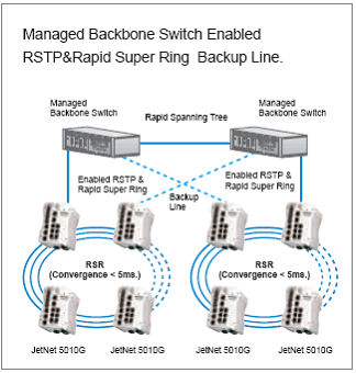 A: 工業(yè)網(wǎng)絡(luò)最普遍的冗余方式是組環(huán)或做loop。典型的結(jié)構(gòu)是,先將網(wǎng)管型交換機(jī)做線性連接,然后將首尾交換機(jī)互連。在這種連接方式下,使用科洛理思(Korenix) Super Ring或Rapid Super Ring技術(shù)便能實(shí)現(xiàn)冗余。Super Ring技術(shù)是科洛理思(Korenix)第一代冗余環(huán)網(wǎng)技術(shù),支持的版本有JetNet 4000和4500系列網(wǎng)管型交換機(jī)。而Rapid Super Ring是科洛理思(Korenix)第二代冗余環(huán)網(wǎng)技術(shù)。這是科洛理思(Korenix)在全球范圍內(nèi)獲專利保護(hù)的新技術(shù)。此Rapid Super Ring技術(shù)改善了Ring Master選擇機(jī)制并大大縮短了自愈時(shí)間。