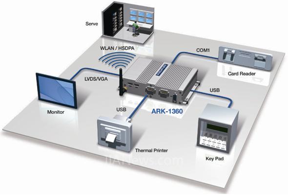ARK-1360帶有1個mini-PCIe插槽,用于WLAN或HSDPA(可選)無線通信,以及用于連接IC卡讀取器的USB接口,這就實現(xiàn)了信用卡、電子現(xiàn)金卡或手機賬戶付款。