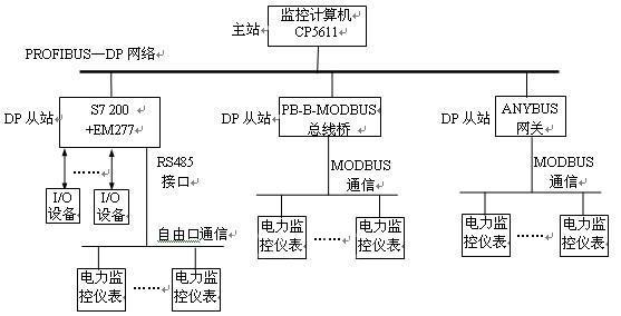 本系統(tǒng)采用安裝了CP5611通信板卡的工控機(jī)作為通信主站,S7-200 PLC CPU222、ANYBUS網(wǎng)關(guān)、PB-B-MODBUS總線橋分別作為PROFIBUS-DP網(wǎng)絡(luò)的三個(gè)從站,每個(gè)從站又與電力監(jiān)控儀表組成一個(gè)子網(wǎng),如圖1所示。系統(tǒng)中同時(shí)也可以連接其他的PROFIBUS-DP從站設(shè)備。