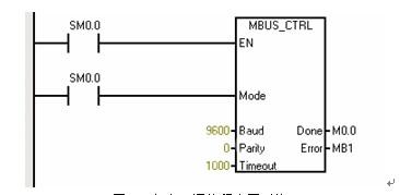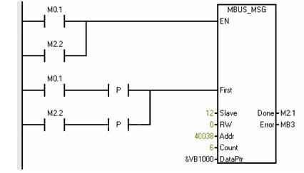 PLC作為自由口通信網(wǎng)絡(luò)的主站,通過(guò)對(duì)PLC進(jìn)行自由口通信編程,實(shí)現(xiàn)PLC與電力監(jiān)控儀表間的MODBUS通信。利用西門子公司提供的庫(kù)函數(shù)MBUS_CTRL和MBUS_MSG可以簡(jiǎn)單方便地實(shí)現(xiàn)MODBUS通信,如圖2、圖3所示。