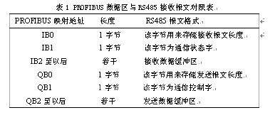 由于總線橋自身不具備控制功能,必須通過(guò)DP主站進(jìn)行控制。DP主站通過(guò)對(duì)其控制字的設(shè)置,來(lái)控制總線橋作為RS485網(wǎng)絡(luò)主站對(duì)其各從站的發(fā)送接收模式,通過(guò)監(jiān)控其狀態(tài)字來(lái)實(shí)現(xiàn)數(shù)據(jù)發(fā)送接收狀態(tài)的監(jiān)控。PROFIBUS數(shù)據(jù)區(qū)與RS485數(shù)據(jù)報(bào)文格式對(duì)照關(guān)系如表1所示。