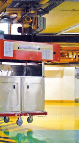 因此,UKD 運(yùn)用一個(gè)自動(dòng)運(yùn)輸輸送機(jī)(ACC)系統(tǒng),該系統(tǒng)由帶滾輪兒的1,100 個(gè)不銹鋼容器組成。工作人員將容器從病房推向ACC。在那里,系統(tǒng)使用手推車傳送帶自動(dòng)地將這些容器送達(dá)它們的目的地。根據(jù)不同的需求,容器分為6 種類型。它們從廚房,藥房,洗衣店,中央存儲(chǔ)或消毒中心運(yùn)送糧食,醫(yī)藥,衣物,設(shè)備,或垃圾到不同的大樓站點(diǎn)。在中央大門,將容器放入系統(tǒng)并通過一個(gè)控制面板將容器發(fā)往不同的目的地。他們還指定回程的目的地以便藥用的容器回到藥房而不是回到洗衣店。
