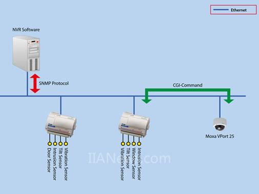 Moxa主動式以太網(wǎng)I/O解決方案支持發(fā)送用戶自定義的CGI命令,這是網(wǎng)絡(luò)視頻監(jiān)控中的常用協(xié)議。有了這個功能,ioLogik E2200系列可以很容易連接IP攝像頭,啟動警報器或?qū)z像頭轉(zhuǎn)至預(yù)先設(shè)定的觀察點(diǎn)。