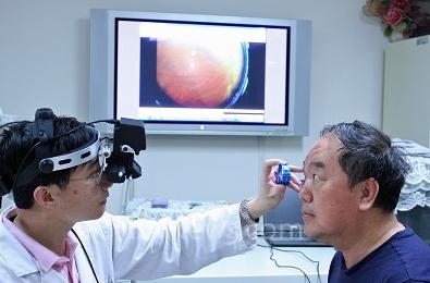 圖片說明:魏文斌醫(yī)生用Keeler無線數(shù)字間接檢眼鏡為病人檢查眼睛