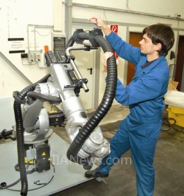 工程師正在為搬運(yùn)機(jī)器人預(yù)裝配拖鏈