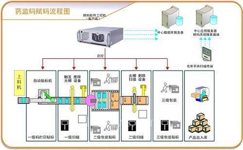 藥監(jiān)碼硬件系統(tǒng)由服務器、打印PC、平面貼標機、現(xiàn)場工控機、藥監(jiān)碼掃描器、條碼打印機等組成,此外還需要根據(jù)系統(tǒng)實施情況對現(xiàn)有設備進行改造。