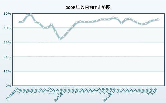 2010年11月,中國物流與采購聯(lián)合會(CFLP)中國制造業(yè)采購經(jīng)理指數(shù)(PMI)為55.2%,比上月上升0.5個百分點。