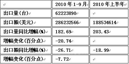 2010年1-9月,中國起重機(jī)出口量為6222臺,比上年同期增長182.69%;出口額約為2.86億美元,比上年同期下滑26.71%,比出口量增幅低209.4個(gè)百分點(diǎn)。見表1。