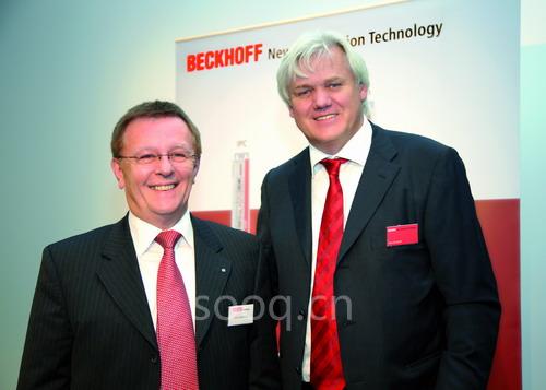 從左至右:Fertig Motors 公司總經(jīng)理 Erwin Fertig,德國(guó)倍福自動(dòng)化有限公司總裁 Hans Beckhoff,拍攝于 2010 德國(guó)紐倫堡 SPS/IPC/DRIVES 展會(huì)上