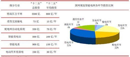 至于具體受益產(chǎn)品,中金公司按未來(lái)市場(chǎng)容量測(cè)算如下:智能電表(71億~90億)、儲(chǔ)能電池(年均45億~60億市場(chǎng))、智能變電站(40億~45億)、柔性輸電(29億~41億)、電動(dòng)汽車充電柜(26億~30億)、配電自動(dòng)化(18億~20億)、智能調(diào)度(18億~20億)和變壓器在線監(jiān)測(cè)裝置(10億~12億)。
