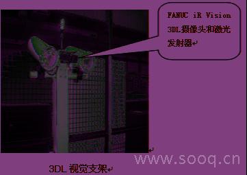 FANUC iR Vision 3DL視覺系統(tǒng):該視覺系統(tǒng)由一個安裝于地面上的3D Laser Sensor完成視覺數(shù)據(jù)采集。該視覺系統(tǒng)解決了定位面有偏差的工件上料位置變化問題。由于待加工工件為毛坯件,機(jī)器人抓取工件后,上料的定位孔位置會發(fā)生變化,甚至工件上料時的平面度也有變化。該技術(shù)可以自動補償位置變化,實現(xiàn)高精度上料。