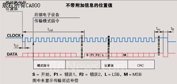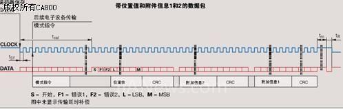在每一幀同步數(shù)據(jù)傳輸時一個數(shù)據(jù)包被發(fā)送,傳輸循環(huán)從時鐘的第一個下降沿開始測量值被保存,計算位置值。在兩個時鐘脈沖(2T)后,后續(xù)電子設備發(fā)送模式指令“編碼器傳輸位置值”(帶或不帶附加信息)。