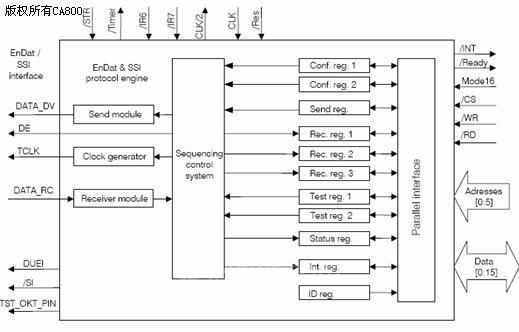 海德漢的合作伙伴MAZet公司針對Xilinx公司的Virtex和Spartan系列及Altera公司的Acex和Cyclone系列提供了EnDat協(xié)議的軟件宏,根據(jù)客戶需求,MAZet公司還可以提供定制軟核。該軟核實現(xiàn)了EnDat接口的所有功能,用戶可通過6位地址線和16位數(shù)據(jù)線與微控制器進行8位或16位的數(shù)據(jù)傳輸。下面是FPGA的模塊圖和電路設計。