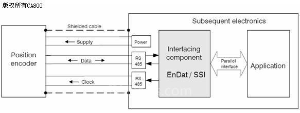 通過遵循RS 一485 (差分信號)標準的收發(fā)元件,在后續(xù)電子設備發(fā)出的同步時鐘激勵下,數(shù)據(jù)(位置值和參數(shù))可以在編碼器和后續(xù)電子設備之間雙向傳輸。
