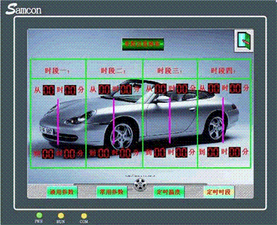 參數(shù)設(shè)置主要分為通用參數(shù),常用參數(shù),定時溫度以及定時時段幾個畫面。通過這幾個參數(shù)設(shè)置畫面,可把各個時間段的溫度以及每個時間段的輪換時間傳送到PLC自動控制各個時間段的溫度變化。下圖為定時時段參數(shù)設(shè)置畫面: