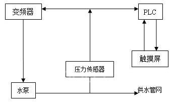 組合應(yīng)用了三菱FX系列PLC,變頻器,顯控(Samcon)SA系列觸摸屏。采用通信方式對變頻器進行控制來實現(xiàn)系統(tǒng)控制功能,用戶可以通過觸摸屏控制系統(tǒng)的運行。通過安裝在出水管網(wǎng)上的壓力變送器,把出口壓力信號變成4~20mA或0~10V標準信號送入PLC內(nèi)置的PID調(diào)節(jié)器,經(jīng)PID運算與給定壓力參數(shù)進行比較,輸出運行頻率到變頻器。控制系統(tǒng)由變頻器控制水泵的轉(zhuǎn)速以調(diào)節(jié)供水量,根據(jù)用水量的不同,PLC頻率輸出給定變頻器的運行頻率,從而調(diào)節(jié)水泵的轉(zhuǎn)速,達到恒壓供水。