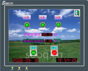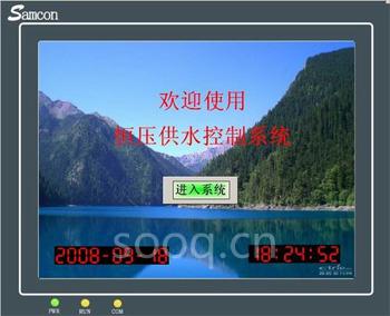 設(shè)備參數(shù)的設(shè)置 在進行通信之前必須對PLC、觸摸屏和變頻器的通訊參數(shù)進行正確設(shè)置。本系統(tǒng)定義為Modbus協(xié)議,波特率為9600,數(shù)據(jù)位為8,無校驗,停止位為1。變頻器除設(shè)置通信參數(shù)外,還需啟用“自由停車”以保護電機。 PLC控制系統(tǒng) 該系統(tǒng)采用三菱FX-200的PLC,繼電器輸出,PLC編程采用三菱PLC的專用編程軟件,軟件提供完整的編程環(huán)境,可進行離線編程、在線連接和調(diào)試。為了提高整個系統(tǒng)的性價比,該系統(tǒng)采用可編程控制器的開關(guān)量輸入輸出來控制電機的起停、自動投入、定期切換,供水泵的變頻及故障的報警等,而且通過PLC內(nèi)置的PID給定電機的轉(zhuǎn)速、設(shè)定壓力、頻率、電流、電壓等模擬信號量。 以往的變頻恒壓供水系統(tǒng)在水壓高時,通常采用停變頻泵,再將變頻器以工頻運行方式切換到正在以工頻運行的泵上進行調(diào)節(jié)。這種切換的方式理論上要比直接切換工頻的方式先進,但其容易引起泵組的頻繁起停,從而減少設(shè)備的使用壽命。而在該系統(tǒng)中采用直接停工頻泵的運行方式,同時由變頻器迅速調(diào)節(jié),只要參數(shù)設(shè)置合適,即可實現(xiàn)泵組的無沖擊切換,使水壓過渡平穩(wěn),有效的防止了水壓的大范圍波動及水壓太低時的短時間缺水的現(xiàn)象,提高了供水品質(zhì)。 觸摸屏界面設(shè)計和運行操作 第一步:確認接通觸摸屏電源,進入觸摸屏歡迎界面,如圖2