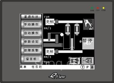 系統(tǒng)在開機時,自動回原點,通過HMI實現(xiàn)系統(tǒng)參數(shù)設(shè)定、手動操作、自動操作、查看故障報警列表,同時還增加了留言板的功能。除外,通過HMI實現(xiàn)實時監(jiān)控系統(tǒng)的運行狀態(tài)以及升降領(lǐng)板的動程的功能。