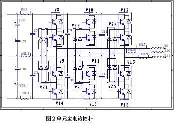 此種類型的設備功率達到1.5MVA,采用單元級聯(lián)結構。系統(tǒng)機構如圖1 所示。系統(tǒng)包括主電路、檢測部分、控制部分。主電路的關鍵是開關元件IGBT,本部分的作用為完成電力的轉換,將直流電網(wǎng)富余的電能轉換為交流電并網(wǎng)。檢測部分主要由傳感器組成,其主要作用為檢測交流電網(wǎng)的電壓、電流、相位,檢測直流側的電壓、電流,并將檢測到的物理信號轉換為弱電信號,將其送入控制單元。控制單元的作用為根據(jù)傳感器輸入的信號和外部輸入的信號做出判斷,輸出PWM信號控制IGBT動作,使其完成電能的轉換;控制單元還具有輸入輸出的接口,接受外部指令信號,并將本系統(tǒng)的狀態(tài)傳給相關的系統(tǒng)。元件每個單元內部采用三點平逆變結構。圖紙幅度所限,在此只給出每個單元的主電路拓撲如圖2所示。采用電解電容作為逆變前的儲能元件,降低直流母線的電壓波動。主開關器件選用IGBT,輸出側使用電抗器濾波。核心控制芯片采用TI公司的 TMS320LF2000系列的芯片,此系列的芯片是專門為電力電子轉換而設計的芯片,有豐富的片內外設功能。包含有如下外設:事件管理器:定時器和用于數(shù)字電機控制的PWM發(fā)生器;CAN接口 ;具有16通道10位A/D;SPI串行外設接口;SCI串行通信接口。