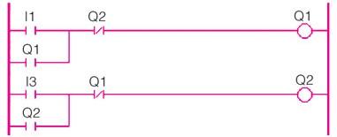 (2)重要的互鎖電路:在某些控制電路中,不同設(shè)備間的動(dòng)作或同一設(shè)備的不同狀態(tài)之間是相互排斥的,所以在控制的時(shí)候宜采用互鎖電路,如圖3所示,利用q1和q2的常開觸點(diǎn)實(shí)現(xiàn)了兩個(gè)電路的互鎖:
