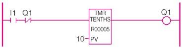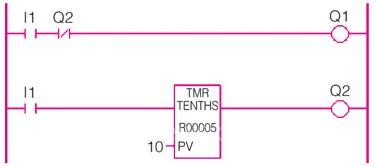 (4)基本時(shí)序控制的延時(shí)斷開電路:i1為電路啟動(dòng)開關(guān),q1在i1啟動(dòng)1秒后斷開,如圖5所示: