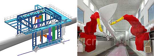 左圖為新型龍門式噴涂系統(tǒng),勝任風(fēng)電機(jī)葉片及其他長(zhǎng)度80米以上結(jié)構(gòu)的涂裝(左);右圖為固定式噴涂系統(tǒng),由兩臺(tái)IRB 5400機(jī)器人進(jìn)行葉片涂裝。