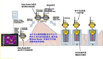 上圖是某一個中型的煤礦企業(yè)采用無線傳感器和超聲波傳感器組成的井下采掘自動監(jiān)控系統(tǒng)的現(xiàn)場圖,圖3是安裝了QT50U超聲波的丈量儀,圖4是在該井口裝有DX70節(jié)點的無線傳感器,圖5、圖6是煤礦礦井的移動泵站,圖7是裝有Data Radio和無線傳感器網(wǎng)關(guān)的位于四周山坡頂?shù)目刂葡?。如圖1所示,井下采掘自動監(jiān)控系統(tǒng)在超聲波傳感器和無線網(wǎng)絡(luò)產(chǎn)品的緊密結(jié)合中完美的實現(xiàn)了遠(yuǎn)程數(shù)據(jù)采集和實時監(jiān)控。通過數(shù)據(jù)的采集,計算機實時控制,抽水移動平臺可以自由移動到任何水位較低的水池。
