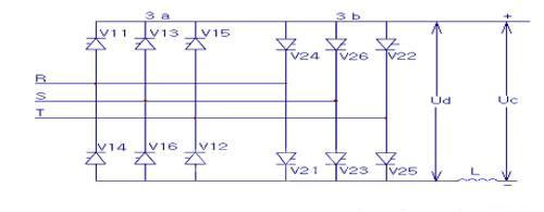 3a:正橋3b:反橋L:中間電路電抗器 V11-V16:正橋晶閘管V21-V26:反橋晶閘管 Ud: 晶閘管供電單元直流電壓 Uc:中間直流電路電壓 圖二 TSU主電路