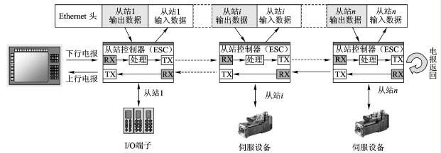 主站發(fā)送以太網(wǎng)幀給各從站 ,從站從數(shù)據(jù)幀中抽取數(shù)據(jù)或?qū)?shù)據(jù)插入數(shù)據(jù)幀 ,然后將該數(shù)據(jù)幀傳輸?shù)较乱粋€EtherCAT從站. 最后一個 EtherCAT從站發(fā)回經(jīng)過完全處理的報文 ,并由第1個從站作為響應(yīng)報文發(fā)送給主站. 主站使用標(biāo)準(zhǔn)的以太網(wǎng)接口卡或具有以太網(wǎng)接口的嵌入式工業(yè)控制計算機, EtherCAT從站使用專用的從站控制芯片ESC.