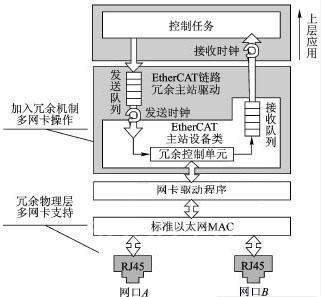 在EtherCAT主站驅(qū)動程序中 ,向上層應(yīng)用的接口主要為 1個發(fā)送隊列 (用于存放控制任務(wù)要發(fā)送的 EtherCAT幀)和1個接收隊列(用于存放處理過后返回的EtherCAT幀).本文設(shè)計的冗余機制旨在實現(xiàn)當(dāng)系統(tǒng)處于任何正?;蛉蒎e運行狀態(tài)下這2個幀隊列都與網(wǎng)口和網(wǎng)絡(luò)狀態(tài)無關(guān).